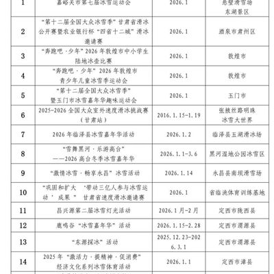 为持续贯彻落实国家体育总局、文化和旅游部“跟着赛事去旅行”促消费系列活动要求,积极培育文娱旅游、体育赛事等新的消费增长点,充分发挥体育赛事对文化、体育、旅游消费的带动作用,省体育局、省文旅厅联合发布“跟着赛事游甘肃”2026年全省100项体育赛事目录。具体如下: